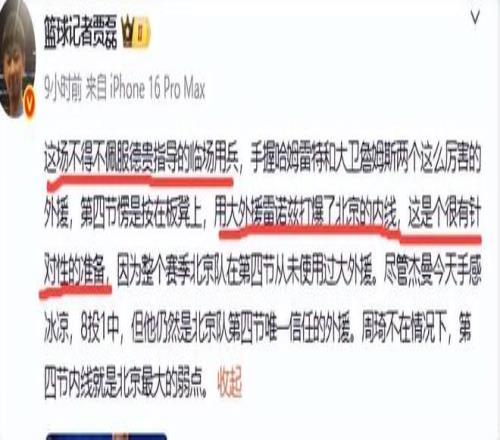 足智多谋!贵叔用场均7分之人打爆北京队,贾磊:不得不佩服贵叔